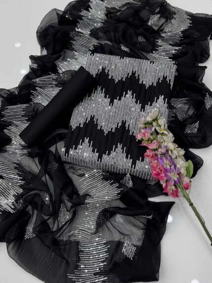 ANEELAS Cotton Embroidered Suit with Chiffon Dupatta – Heavy Sequin Work