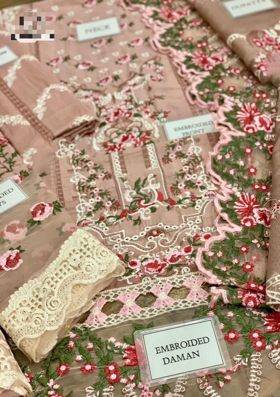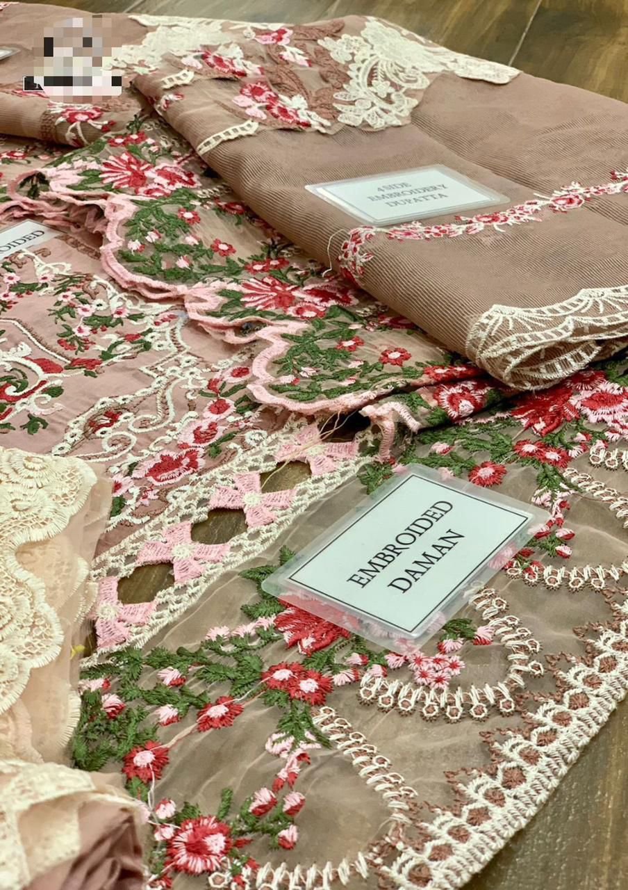 lawn fully heavy embroidered scifflie & multi threat embroidered centre panel with fully heavy embroidered scifflie & multi threat embroidered left & right panel attach with fully heavy embroidered daman boarder with cut work